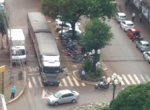 Carreta bitrem na av. Capitão Índio Bandeira, no centrão de Campo Mourão. O flagra foi às 9h20 desta sexta-feira.