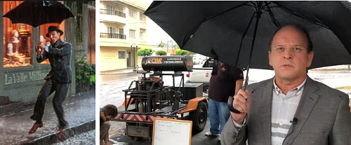 Responda rápido: o que o vereador Luiz Alfredo e o ator/dançarino Gene Kelly têm em comun? Ah, com as fotos acima ficou fácil, né? Gene Kelly estrelou o clássico "Cantando da Chuva", enquanto o nobre edil apareceu nas telinhas das redes sociais, nesta terça-feira, "fiscalizando na chuva". No caso é a fiscalização do recape asfáltico. Tanto o ator do filme de 1952, como o vereador se viraram com o bom e velho guarda-chuvas...