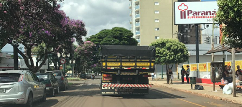Caminhão passa pela av. Irmãos Pereira, no centro de Campo Mourão, nesta terça-feira.