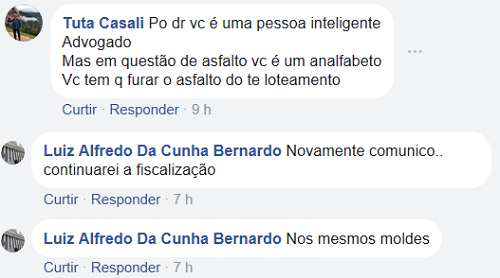 Voz de prisão - Em outra postagem no Facebook, Luiz Alfredo disse que só não deu voz de prisão por crime de prevaricação aos dois fiscais da prefeitura que acompanhavam o recape porque os familiares deles"não mereciam passar por esse dissabor". O vereador conclui que a culpa era exclusiva da "irresponsabilidade de gestão" do prefeito.