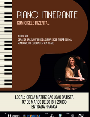 Show de piano - A pianista Gisele Rizental fará show nesta quarta-feira (20h30) na Igreja Matriz de Peabiru. E com entrada franca. A cidade foi uma das poucas selecionadas para apresentação do Projeto Piano Itinerante da Secretaria de Estado da Cultura.