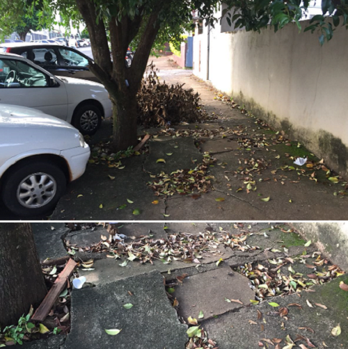 Situação da calçada em frente a Secretaria de Saúde de Campo Mourão. Praticamente intransitável. Piso quebrado, mato obstruindo a passagem e copa de árvore muito baixa. Se eu tive dificuldade em passar, imagine as pessoas que vi por ali, usando cadeiras de rodas.