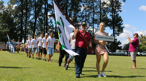 Os 13 prrefeitos da região que foram prestigiar a abertura da 1ª Copa Comcam Sicredi, em Araruna, não ficaram só assistindo, não. Participaram do desfile de abertura levando a bandeira de seus municípios. Olha o mourãoense Tauillo Tezelli aí, de porta-bandeira.