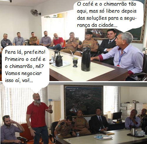 Os cliques são de sexta-feira, em Campina da Lagoa, onde o prefeito Milton Luiz Alves reuniu autoridades da segurança pública para debater soluções para o aumento da crimminalidade na cidade. Falou-se em "falta de estrutura e deficiência de efetivo" das polícias Civil e Militar. Entre os presentes, o delegado-chefe da 16ª SDP, Nagib Nassif Palma, e o comandante do 11º BPM, major Júlio César Vieira da Rosa.