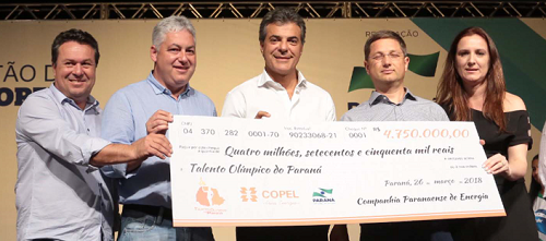 Nesta segunda-feira, em Campo Mourão, o governador Beto Richa também participou do evento Gestão do Esporte, promovido pela Secretaria de Estado do Esporte e Turismo. No encontro, ele recebeu do diretor jurídico e de relações institucionais da Copel, Cristiano Hotz, um checão de R$ 4,7 milhões para garantir bolsas aos atletas do TOP deste ano. A Copel é a patrocinadora do programa.