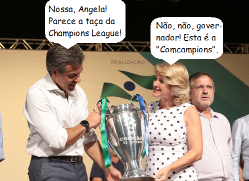 A presidente da Comcam, Angela Kraus (Farol), aproveitou a presença do governador Beto Richa no Teatro Municipal, em evento sobre esporte, e apresentou a ele a taça da Copa Comcam Sicredi. É "orelhuda" igual a taça da Champions League, mas só parece. Digamos que é a "Comcampions"...