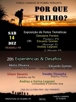 Esse é o nome do evento que a prefeitura de Peabiru e a "Família Caminhos de Peabiru" realizam no próximo dia 14 (20h). Será na Casa da Cultura. Haverá relatos - "Experiências & Desafios" - sobre Santiago de Compostela, caminho Inca, Machu Pichu, Caminho da Fé, Caminho de Itupava e Caminho da Luz (Vale Europeu). Também haverá exposições de fotos.