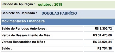 Saiu o relatório com as despesas ressacíveis de outubro dos deputados estaduais. De Campo Mourão, Douglas Fabrício fechou o mês com R$ 34 mil, um pouco acima da verba mensal, mas o gabinete tinha sobras e, por isso, sem problemas. Douglas ainda iniciou novembro com "setecentão" no caixa. Cada deputado tem R$ 31,4 mil para os gastos mensais.