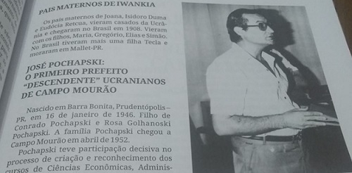 O ex-prefeito José Pochapski teve citação especial no livro "A saga da imigração ucraniana em Campo Mourão e região", lançado este mês pela professora Maria Melniski. Pudera. Foi o primeiro (e único), prefeito mourãoense descedente de ucranianos. Foi eleito em 1982, com 12.012 votos (mais que os outros quatro candidatos juntos), e administrou a cidade até o início de 1989. Pochapski ainda foi vereador de 2009 a 2012 e atualmente está em Prudentópolis.