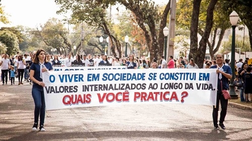 "O viver em sociedade se constitue em valores internalizados ao longo da vida. Quais você pratica?". Esse fo o tema que a escola Educare levou ao desfile de 7 de Setembro, em Campo Mourão. Foram cinco alas com valores que se aprendem na sociedade, escola, família, trabalho e religião. Não faltou a "inversão de valores", onde apareceram a desonestidade, hipocrisia, vandalismo e corrupção entre outros.