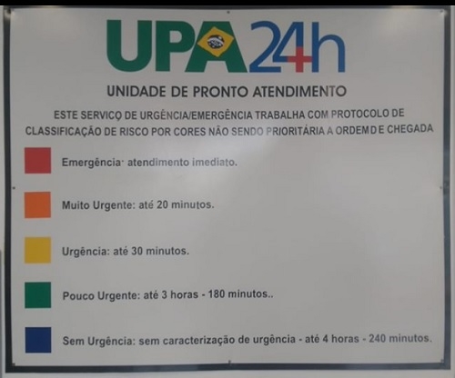 Quem entrar na UPA de Campo Mourão, que começa a atender nesta sexta-feira (7h), vai dar de cara com essa placa aí. Ela deixa claro que a ordem de atendimento é a da "classificação de risco" e não a de chegada. Para casos de emergência, por exemplo, é "atendimento imediato". Mas se for sem urgência, a espera pode ser de até quatro horas.Uma outra placa explica a diferença entre a UPA e os postinhos de saúde.