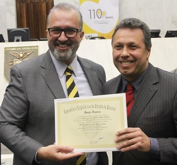 O que o diretor do câmpus de Campo Mourão da UTFPR, Heron dos Santos Lima, está fazendo na Assembleia Legisaltiva? Ele foi um dos homenageados nesta quinta-feira na sessão que comemorou os 110 anos da instituição. A iniciativa foi do deputado Alexandre Amaro (Republicanos). Heron recebeu o título das mãos de outro deputado, Aroldo Martins. A UTFPR foi fundada em 23 de outubro de 1909, como Escola de Aprendizes. Virou universidade em 2005 e tem hoje 13 câmpus no Estado.