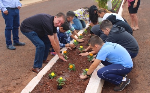 Quarto Centenário - A prefeitura plantou mudas de flores no canteiro em frente à igreja matriz. Alunos da escola municipal Germana Moleiro e o prefeito Reinaldo Krachinski participaram.
