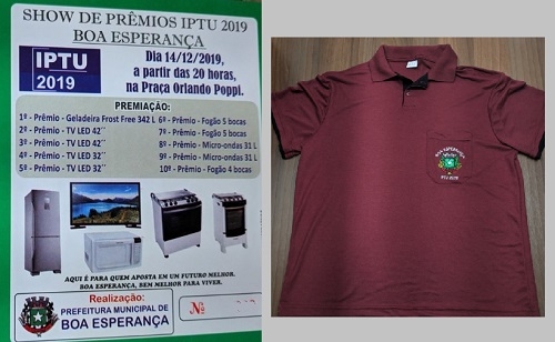 Se você mora em Boa Esperança e pagou em dia o IPTU deste ano, já pode ir à prefeitura para retirar uma camiseta. É o brinde aos bons pagadores. Também já dá para preencher o cupom e concorrer a prêmios que serão sorteados em dezembro. Tem geladeira, quatro TVs, três fogões e dois microondas. O sorteio é tradição no município e ajuda a manter um dos mais baixos indices e inadimplência, na casa dos 5%.