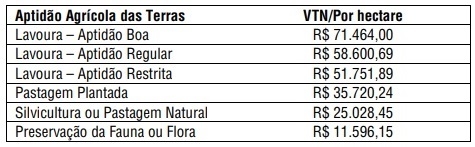 Decreto do prefeito Tauillo Tezelli atualizou o valor da terra nua em Campo Mourão para efeito de cobrança do Imposto Territorial Rural. O hectare passou a variar de R$ 11,5 mil a R$ 71,4 mil. Segundo a prefeitura, os valores foram obtidos em laudo técnicao realizado por profissional legalmente habilitado. Veja quadro acima.