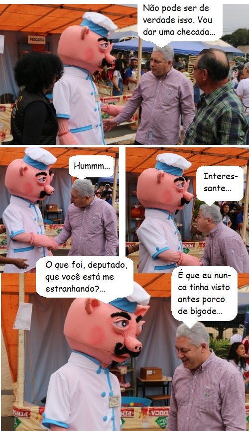 Os cliques são da Festa do Porco no Tacho realizada domingo pela paróquia do conjunto Cohapar, em Campo Mourão. O deputado Douglas Fabrício esteve por lá e, pelo visto, ficou encucado com o mascote do evento...