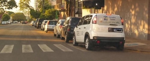 Carro do Conselho Tutelar dando mal exemplo para as crianças e adolescentes. Foi estacionado em cima da faixa e na frente de rampa para cadeirantes.