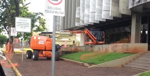 Feriado nesta segunda-feira em Campo Mourão e a máquina que trabalha em melhorias no Fórum foi deixada na calçada mesmo.