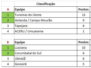 Como está - Falta uma rodada e Tuneiras e Luiziana já estão classificados em primeiro em seus grupos. No A, Holanda e Tapejara brigam pela segunda vaga. No B, Corumbataí, Ubiratã e Goioerê chegam embolados e com chances de classificação.