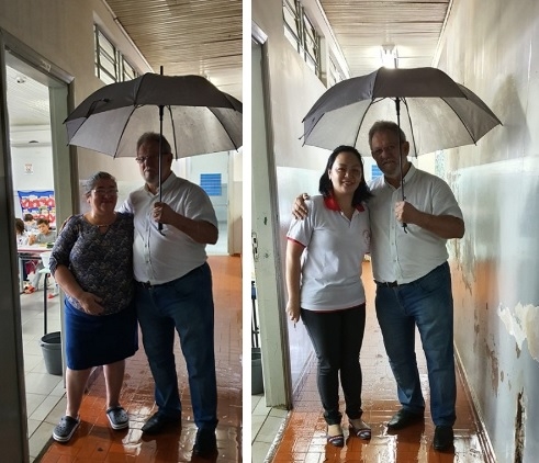 O que é isso, o vereador Edson Battilani usando guarda-chuva em estrutura coberta? Sim, mas tem explicação. Ele esteve na escola Bento Mossurunga, no jardim Copacabana, em dia de chuva (fraca) e viu que o local sofre com goteiras e infiltrações. Aí só com guarda-chuva mesmo. E haja balde.