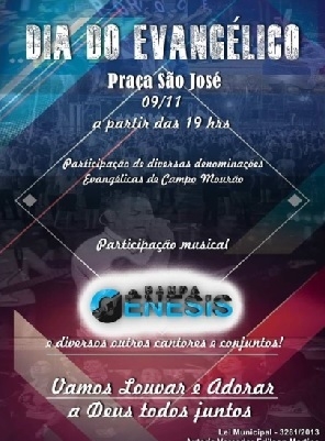 1) Campo Mourão comemora neste sábado o Dia do Evangélico. A partir das 19h haverá culto em celebração na praça São José. Mais de 10 igrejas confirmaram presença. São esperadas cerca de 5 mil pessoas.