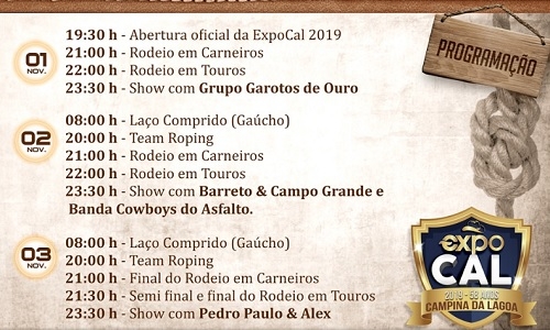Começa nesta sexta-feira a Expocal, evento que marca a comemoração pelos 58 anos de emancipação de Campina da Lagoa. A abertura oficial será às 19h30. Em seguida acontecem rodeios e show com o grupo Garotos de Ouro. A programação vai até domingo, no Parque de Exposições, sempre com entrada franca. O encerramento será com show da dupla Pedro Paulo & Alex.