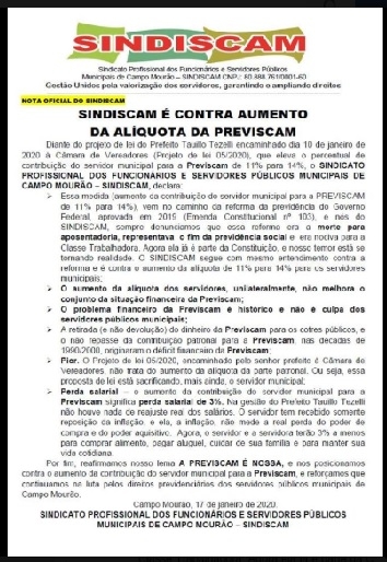 O Sindicato dos Servidores Municipais de Campo Mourão é contra o aumento da alíquota da Previscam para 14%.