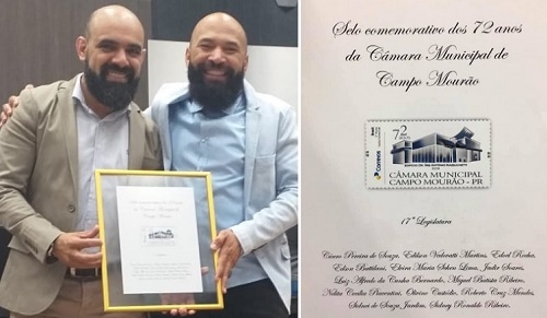 A Câmara de Campo Mourão lançou na quinta-feira, em parceria com os Correios, o selo comemorativo aos 72 anos de instalação do legislativo municipal. Cada vereador indicou uma pessoa para receber o selo. O padre Nilson Reis foi o indicado do vereador Jadir Pepita, mas na foto está com o vereador Prof. Cícero. Só não pergunte quem é o padre e quem é o vereador. Nem eles sabem...