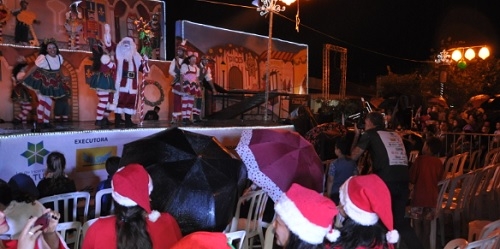 A chuva da noite desta terça-feira, em Campo Mourão, atrapalhou o espetáculo "As três chaves de Natal", no jardim Tropical. Houve apenas as coreografias que antecedem o espetáculo e a encenação da parte final, com a chegada do Papai Noel. Um bom público ainda ficou no local, protegido por guarda-chuvas. As mamães noelas distribuíram balas.
