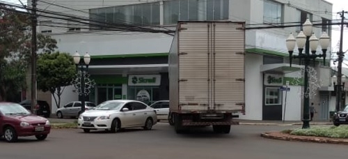 Caminhão faz manobra irregular no centro de Campo Mourão. Foi nesta quinta-feira, na esquina da av. Irmãos Pereira com a rua São Paulo.