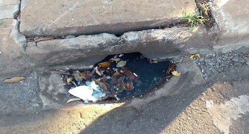 Bueiro acumulando água da chuva, para alegria do mosquito da dengue, na esquina da av. Goioerê com a rua Interventor Manoel Ribas.