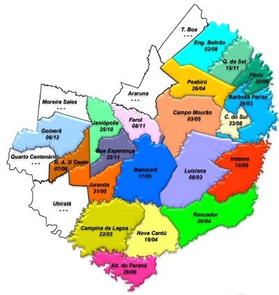 Mapa da Emater mostra o calendário regional das caminhadas internacionais na natureza de 2020. Onde está colorido é porque haverá o evento. Apenas os cinco municípios em branco ficaram de fora. Quem? Quem? Quem? Araruna, Moreira Sales, Quarto Centenário, Terra Boa e Ubiratã.