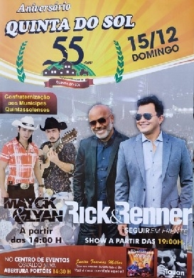 A dupla Rick & Renner fará show no próximo dia 15, em Quinta do Sol. A apresentação vai marcar o aniversário de 55 anos de emancipação do município. Será no Centro de Eventos, a partir das 19h, com entrada franca. Os portões vão abrir bem mais cedo (14h) e estão programados vários outros shows.