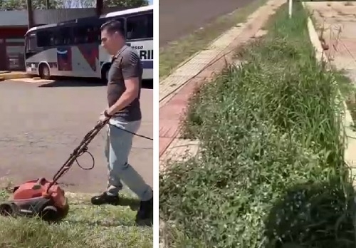 Ele se irritou pelo fato da prefeitura não cortar a grama da calçada e do jardim em frente ao legislativo.