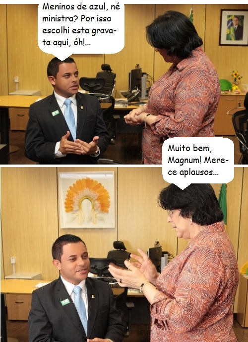 Não foi apenas com o presidente Jair Bolsonaro que o "recepcionista oficial" de Campo Mourão, Magnum Alves, esteve em Brasília, não. Ele também se encontrou com a ministra Damares Alves. É aquela, que ficou famosa pela frase "meninos de azul e meninas de rosa". Damares também ganhou um quadro com desenho dela feito por Magnum.