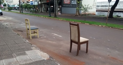Cadeiras deixadas na av. Manoel Mendes de Camargo, área central de Campo Mourão, na manhã desta quarta-feira.