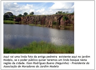 3 de abril de 2013. A prefeita era Regina Dubay, ainda em início de mandato. Ilson Bueno, o "Neguinho", era presidente da Associação de Moradores do Jardim Modelo. Olha a foto que ele mandou pra gente. "Se o poder público quiser teremos um lindo bosque nesta região da cidade", escreveu na época. Neguinho hoje é diretor de Gabinete do prefeito Tauillo Tezelli e a antiga pedreira já foi licitada para virar parque.