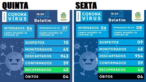 Não houve novos casos de coronavírus nesta sexta-feira em Campo Mourão. Seguem 59. O número de suspeitos caiu de 10 para nove. Só que o número de pessoas internadas aumentou de 11 para 14. Na enfermaria, por exemplo, passou para seis, sendo quatro mourãoenses. Na UTI são oito os leitos ocupados - três com moradores de Campo Mourão. Desde o início da pandemia, o máximo de leitos ocupados foi nove, no começo de abril.