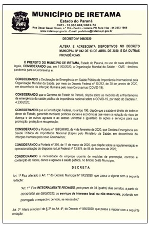 A prefeitura de Iretama voltará a decretar o fechamento do comércio.