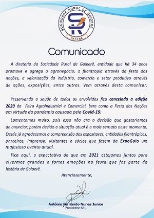 A Sociedade Rural de Goioerê divulgou comunicado nesta quarta-feira sobre o cancelamento da Expogoio.