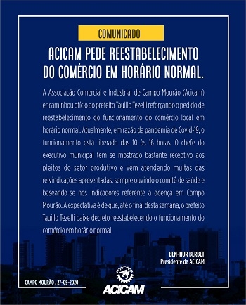 A Acicam voltou a pedir à prefeitura que seja retomado o horário normal para o comércio de Campo Mourão.