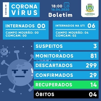 Boletim da Secretaria de Estado da Saúde divulgado nesta quinta-feira mostra que não houve novos casos de Covid-19 na região nas últimas 24 horas. Boca Santa faz uma comparação de Campo Mourão (28 casos) com outras cidades do Paraná. Paranavaí, por exemplo, tem 10 confirmações (um óbito). Umuarama tem dois, Toledo e Guarapuava um cada.