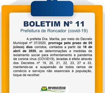 A prefeita de Roncador, Marília Gonçalves, prorrogou por mais cinco dias as medidas de combate ao coronavírus.