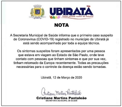 Mora em Ubiratã a primeira pessoa da região suspeita de estar com coronavírus. A Secretaria de Saúde divulgou nota a respeito. O morador esteve em São Paulo, onde manteve contato com outras pessoas com sintomas que, por sua vez, estiveram na Europa. "Todas as precauções necessárias para o controle da doença estão sendo tomadas", frisou a secretária Cristiane Pantaleão.