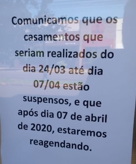 O Cartório de Registro Civil de Campo Mourão suspendeu todos os casamentos marcados até 7 de abril.