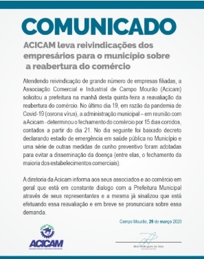 A Acicam pediu que a prefeitura de Campo Mourão reavalie a decisão de manter o comércio fechado.