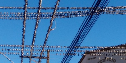 Andorinhas superlotam fios da rede elétrica no centro de Campo Mourão (esquina da av. Capitão Índio Bandeira com rua São Paulo), na manhã desta terça-feira. Sebastião Viter