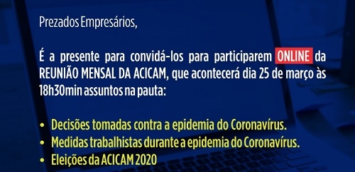 A Acicam realiza nesta quarta-feira (18h30) sua reunião mensal.