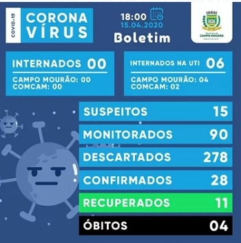 Boletim desta quarta-feira com poucas novidades com relação ao Covid-19 em Campo Mourão. Os números de confirmações (28), recuperações (11) e mortes (quatro) são os mesmos no dia anterior. Os pacientes na UTI (6) também. Os casos suspeitos caíram de 21 para 15. Os internados sem UTI caíram de três para zero. Os monitorados eram 93 e agora são 90.