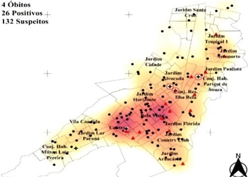 A prefeitura mostrou neste domingo, durante live, como o coronavírus está circulando em Campo Mourão. O trabalho foi feito com ajuda de professores da UTFPR. Os pontos pretos mostram os casos suspeitos (eram 132 quando foi feito o mapa). Os círculos com cruzes são os casos confirmados (26) e os triângulos vermelhos as quatro mortes. A área central aparece em vermelho por concentrar mais casos (mapa de calor).